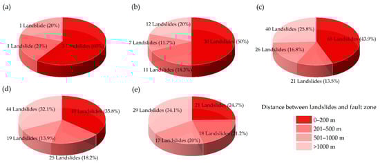 The distance between the active landslide and the fault zone in the TPRR ((a) the distance between the huge-scale landslide and the fault zone; (b) the distance between the super-large-scale landslide and the fault zone; (c) the distance between the large-scale landslide and the fault zone; (d) the distance between the medium-scale landslide and the fault zone; (e) the distance between the small-scale landslide and the fault zone).