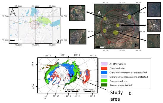 Distribution of surface types in the 10 km buffer zone around the collapse site in the Norilsk region: (a) shows the geographical location of the study area; (b) represents a satellite map of the study area, where area1–area5 represent five typical features: buildings, hills, the plant where the tank collapse occurred, vegetation, and water, respectively; and (c) shows biophysical permafrost distribution results.