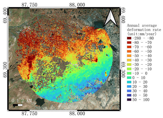 The water in the active layer of the permafrost continuously changes between the solid and liquid states with the alternation of seasons. Since the ice approximately takes 9% more volume than water, the seasonal ice–water phase change process will lead to changes in the volume of permafrost. This process in turn will cause periodic freeze-swelling and thaw-sinking of the ground surface and seriously damage the stability of engineering infrastructure in the region [,,]. Another study shows that the global average near-surface temperature has climbed at a rate of approximately 0.6 C/10-years in the past 30 years. Moreover, the rate of increase in near-surface temperature in permafrost areas is two to three times the rate of the increase in global temperature. Even for , the release of which from the melting of permafrost has further intensified global warming [,,,,]. In this context, a series of permafrost degradation problems, such as the melting of subsurface ice in permafrost and the increase in active layer thickness, are becoming increasingly significant. The resulting surface deformation may undermine the stability of buildings and infrastructure on permafrost and lead to surface deformation disasters [,,,,,]. For instance, freeze–thaw hazards from global climate warming and China–Russia permafrost degradation induce uneven deformation of the China–Russia crude oil pipeline (CRCOP), which threatens the CRCOP’s operational safety []; seasonal permafrost surface displacement in the Litang River alluvial area imperils the construction and normal operation of the Sichuan Tibet Railway []; landslides of the Bei’an to Heihe Expressway in China are often caused by uneven degradation and settlement from the warming climate, which disrupts highway operational safety [].