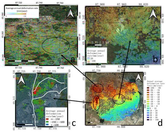 Deformation rate differentiation of non-homogeneous ground features: (a–c) take on the deformation rate distribution of the northwestern town area, the central plant area, and the western steep hill area, respectively; (d) is from Figure 4.