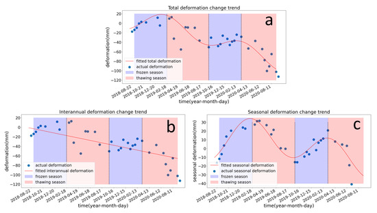 Figure 6b shows that the interannual land surface in the area of the tank collapse site always sinks at a rate of approximately −35 mm/year during 2018–2020. Apart from that, we also find that the seasonal deformation (Figure 6c) has an annual cyclic sinusoidal trend—summer subsidence and winter uplift, with a general sinking depth of approximately 10–20 mm in summer and a maximum uplifting height of approximately 30 mm in winter. This is consistent with the “seasonal deformation characters” in Figure 6a: the surface slightly rises during the freezing period in the winter, while the surface sinks faster during the melting period in the summer. This winter result may be due to a slight surface uplift in winter offsetting the interannual sinking deformation trend. Whereas, the area where occurred the tank collapse undergoes steeply increasing settlement in summer. This serious subsidence is due to the combination of summer thawing and sinking and the interannual sinking trend.