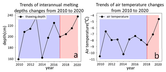 Trends of interannual melting depth and annual average air temperature over the period 2010–2020: (a) interannual melting depth; and (b) annual average air temperature.