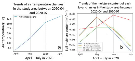 Trends of the average monthly air temperature and soil moisture content for the period April 2020–July 2020: (a) the average monthly air temperature; (b) the soil moisture content.