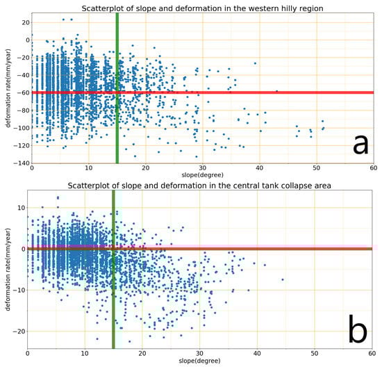 The scatterplot results between surface deformation rate and terrain slope from randomly selecting 5000 points in the following areas: (a) the western hill area; and (b) the central tank collapse area.