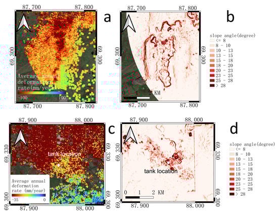 Comparison analysis of surface deformation rate and topographic slope in the study area based on GEE and QGIS platform: (a) the distribution of topographic slope in the western hilly region; (b) the rate of surface deformation in the western hills; (c) the results of topographic slope distribution in the central tank collapse area; (d) the distribution of surface deformation rate in the central tank collapse area.