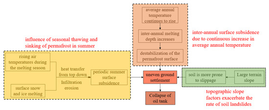 The seasonal deformation characteristics of permafrost are summer subsidence and winter uplift (Figure 6c). It is noteworthy that the moment of oil tank collapse is exactly in the permafrost summer thawing and sinking stage, where the air temperature gradually increases (Figure 8a). During this period, the heat constantly transfers from the top to the bottom of the active layer, which is only in the heat-absorption state, moving down the thawing front and melting the underground ice. Additionally, down filtration erosion of surface snowmelt also accelerates the above process. As this course ceaselessly develops during summer, seasonal subsidence trends persistently accumulate, aggravating permafrost land surface instability.