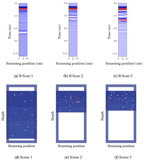 Examples of the simulated B-Scans (a–c) and visualizations of the corresponding setups (d–f).