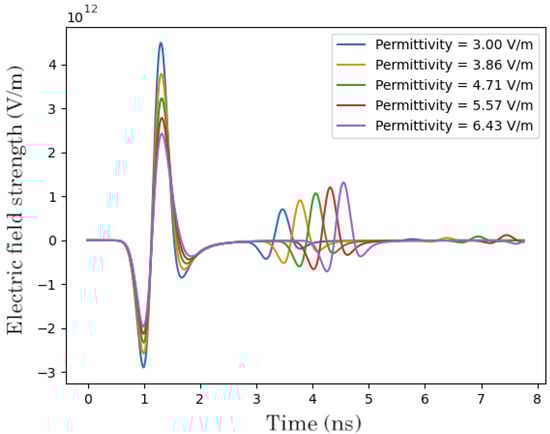 Simulated A-scans of a material block with different relative permittivities. Higher relative permittivity increases the wave’s travel time.