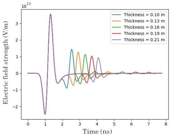 The output of the GPR scanning process is a radargram. It is a 2D array (also called B-scan, see Figure 1) of electric field strength values, where each column (also called A-scan) corresponds to the field strength over time for one spatial position along the scanning direction. Analyzing such radargrams manually is a laborious process. Objects of different permittivities and sizes will affect the traveling velocity of the source wave. Such behavior can be seen in Figure 2, Figure 3 and Figure 4, which show the results of scanning simulations in a setup with a solid material block for one column (spatial location) of the radargram. Therefore, the goal is to determine the traveling velocities of the waves, allowing to estimate the dielectric properties of the material in the examined object. The Figure 2 and Figure 3 demonstrate the effect of a permittivity change and a thickness change, which can be observed to strongly influence the wave’s velocities. The change in conductivity mostly affects the amplitudes and not the velocities, as can be seen in Figure 4.