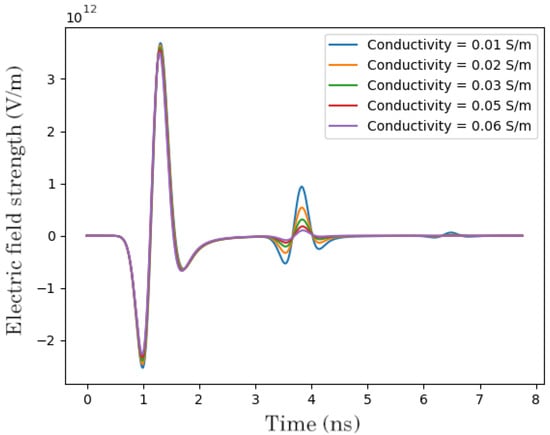 Simulated A-scans of a material block with different conductivities. Higher conductivity mostly affects the amplitudes of the peaks and not the wave’s velocity.