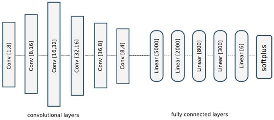 Schematic description of the employed CNN model. The output of six convolutional layers is flattened and passed as an input to a series of five fully connected linear layers. Softplus enforces positive values on the output.