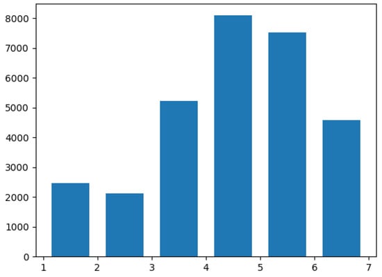 The corresponding targets in the dataset—the wall configurations—were represented by a stack of up to 6 rectangular blocks. The combinations of different material layers were generated randomly. First, we uniformly sampled the number of layers. Next, we sampled the thicknesses and permittivities from a multinomial distribution, which is a generalization of a binomial distribution. It allowed us to sample several variables (thicknesses) at once and avoid the issue when most of the given volume was taken by the first layers. Since there were up to 6 layers, there were 12 variables encoding a target in a configuration: 6 for thickness and 6 for relative permittivity. Furthermore, since the prediction of the further layers is more difficult, we filled the dataset with more instances of the more layered structures, as can be seen from the distribution of the samples over the number of layers in Figure 6.