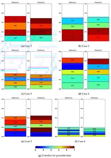 The results of the CNN’s performance are visualized in Figure 7, where we show six examples from the test dataset (left) together with the output of our trained model (right). We omitted the structures with few layers in this visualization in order to showcase the more complex cases, but we provide such results in Table 2. We observe that low permittivity layers negatively affect the quality of prediction in further layers, as can be seen in Figure 7a,b,e. In Case 1 from Figure 7a, the first layer has a permittivity of 3.93, which is predicted fairly close by the model to be 4.05. However, the prediction error in subsequent layers is already more significant, ranging from 0.48 to 1.12. A similar situation appears in Case 5 from Figure 7e. The first layer has a permittivity of 2.72, and its thickness and permittivity are predicted quite well by the model, but the further layers have a visible divergence from the reference configuration both in terms of thicknesses and permittivities. The opposite situation can be observed in Case 2 from Figure 7b. The first layer has a quite high permittivity—6.76. The range of prediction errors for the further layers stays between 0.05 and 0.27, and even around 0.05–0.06 for the first layers, which is a significantly better prediction than with the previously mentioned cases. A similar behavior can be observed in cases Figure 7c,d. In Case 6 from Figure 7f, we can also see an accurate prediction of the first layers with high permittivity. However, due to the second layer having a low permittivity value of 3.02, the prediction errors in the further layers rapidly increase, going from 0.79 to 1.46.
