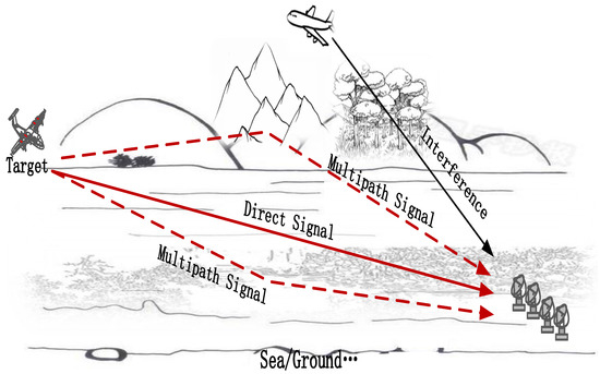 However, the desired target echo signals are strongly correlated or even completely coherent with multipath signals in complex scenes, such as the low-altitude targets surveillance within sea/ground surface or urban background, which brings severe challenges to radar target signal receiving, detecting and tracking. The multipath effect [8,9] refers to the electromagnetic wave transmission through different paths. Besides the direct path from the source to the receiving end, the electromagnetic wave propagation path also includes more than the rest of the transmission path. When the received signals are uncorrelated, the traditional adaptive beamforming methods [10,11,12], such as minimum variance distortionless response (MVDR) [13] and Minimum Mean Square Error (MMSE), can effectively receive the target signal while suppressing the irrelevant interference signal, so as to output the maximum SINR. However, in a multipath environment, the target signal has multiple receiving paths, and the received signals of different paths are highly correlated, or even coherent. The direct signal and reflected signal are superimposed according to their respective phases at the receiver, resulting in distortion or error of the target signal. As a result, the performance of traditional beamforming technology deteriorates dramatically in a multipath environment [14]. Signal attenuation and delay caused by the multipath effect directly affect the target detection, tracking and recognition performance of electronic reconnaissance equipment, so it has been widely studied by experts and scholars in the radar field. In the 1950s, a large amount of theoretical and experimental research was carried out on the problems caused by the multipath effect, mainly analyzing the characteristics of a low altitude target echo and multipath reflection [15,16]. In the 1970s, experts began to build low-altitude echo models to suppress and separate multipath signals.