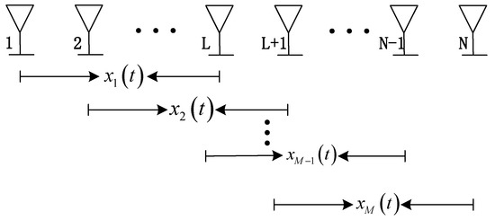 As shown in Figure 2, the array is divided into overlapping subarrays of size L according to the signal model shown in Equation (1). The total number of subarrays is . The signal model of the mth sub-array can be expressed as