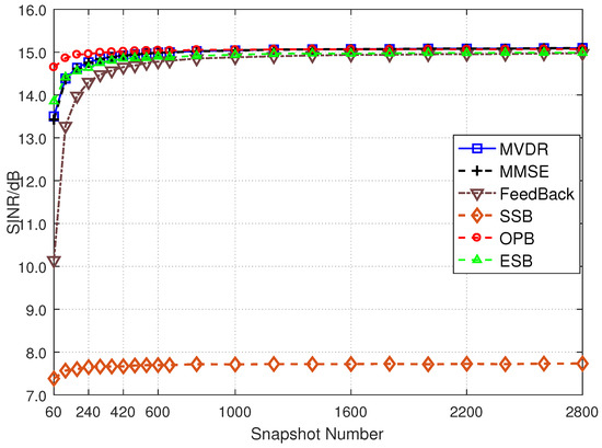 In this experiment, the main topic discussed is how the output SINR of the proposed method and other algorithms varies with the snapshots of the echo data. In the scenario set above, the snapshot number of the echo data changes from 60 to 2800. Monte Carlo simulation is performed with 400 trials for each value of snapshot.