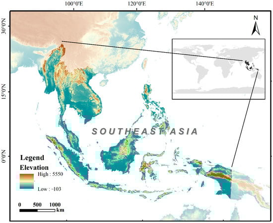 Southeast Asia is located in the southeastern part of Asia, with a total area of about 4.57 million km2. It is adjacent to the Pacific Ocean to the east and the Indian Ocean to the west. It is at the crossroads between Asia, Oceania, the Pacific Ocean, and the Indian Ocean [23,24]. Southeast Asia is an indispensable area for international trade [25,26,27]. On the basis of the terrain, it can be divided into two sections: the Indo-China Peninsula and the Malay Archipelago [28]. Most of the Indo-China Peninsula has a tropical monsoon climate, and the year consists of a dry season and a rainy season [29]. Most of the Malay Archipelago has a tropical rain forest climate, with high temperatures, rain all year round, and dense tropical rain forests [30]. Southeast Asia also has a large population [31,32]. It is rich in mineral resources, of which tin and oil are the most famous [33,34]. The countries not only contain abundant terrestrial mineral resources but also have a huge development potential due to their long coastlines and vast areas. So, the rapid expansion of land reclamation, marine aquaculture, and oil palm plantations continues [35], causing great changes in land cover and land use [36].