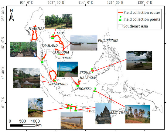With the support of the Chinese Academy of Sciences (CAS) Earth Big Data Science Project of China, we conducted 56 days of field data collection in Southeast Asia, in 2018 and 2019. Southeast Asia is located in the equatorial region and is on the crossroads between Asia and Oceania, as well as the Pacific Ocean and the Indian Ocean. The region is hot and humid, and it is cloudy and rainy all year round [21], which reduces the quality of remote sensing optical images. Southeast Asia is also densely populated and has undergone a rapid economic development [22], with rapid changes in land use types and a high human interference intensity, which makes it a key research area for global biogeochemical changes.