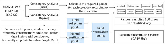 To solve the problem of the uneven distribution of points, we collected additional points from the high-spatial-resolution images. First, we randomly generated points based on the consistency analysis results of the three existing land cover products. Next, we verified the class of the points by combining Google’s high-resolution remote sensing images. Then, we conducted a consistency analysis and comparison, including a spatial consistency and an area consistency, of the three land cover products. According to the spatial consistency, we confirmed the spatial locations and collected additional validation points. A high regional spatial consistency indicates that the ground object type is assured, while a low regional spatial consistency indicates that the area is confusing and should be paid more attention. Therefore, we randomly generated more points in areas with a low spatial consistency than in those with a high spatial consistency. The added points could help to solve the problem of the uneven spatial distribution of the validation points. According to the area consistency, we calculated the area proportion of each class. To meet the quantitative requirements of the area ratio between classes, we conducted random and stratified sampling. To reduce any accidental error, the mean value of 100 sampling results was taken as the final result. The method flow is presented in Figure 4.