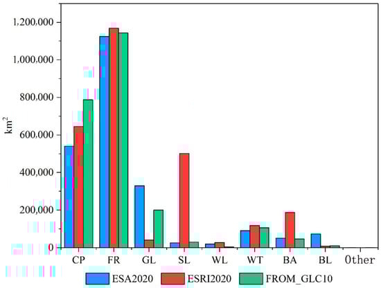 According to Figure 6, the forest and water areas were highly consistent in ESA2020, ESRI2020, and FROM-GLC10. The proportions of the forest area to the total land cover area in ESA2020, ESRI2020, and FROM-GLC10 were 49.84%, 43.35%, and 49.08%, respectively; and the proportions of the water area to the total land cover area were 4.03%, 4.38%, and 4.57%, respectively. The cropland area of FROM-GLC10 (786,799.12 km2) was greater than those of ESA2020 and ESRI2020. The cropland proportions of ESA2020 and ESRI2020 were 23.95% and 23.91%, respectively, and their area proportions were relatively consistent. The grassland, shrubland, and built-up areas in ESA2020 and FROM-GLC10 were relatively consistent. In ESRI2020, the proportions of grassland and shrubland areas to the total area were 1.50% and 18.62%, respectively, significantly different from their proportions in the other two products. The built-up areas in ESA2020, ESRI2020, and FROM-GLC10 were 51,466.86 km2, 186,863.85 km2, and 46,856.13 km2, accounting for 2.28%, 6.94%, and 2.01% of the total area, respectively. The built-up area in ESRI2020 was higher than those of the other two land cover products. In ESA2020, mangroves were classified into a separate class. However, according to previous research, mangroves belong to wetland ecosystems. Therefore, in this study, we classified the mangroves as wetland. In ESA2020, the area of wetland was 91,009.76 km2, which was low compared with the wetland area in ESRI2020 but high compared to the wetland area in FROM-GLC10.