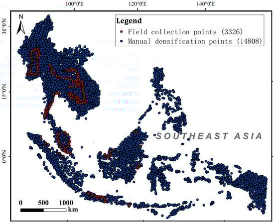 As per the spatial distribution map of the field collection points (Figure 3), the points exhibit a biased distribution, which does not conform to the principle of a uniform distribution of the validation sample points [46]. The cost of field collection is high, and due to limited funds and time, most of the field sampling points were located in the vicinity of a road, resulting in the spatial distribution being centered on and around the inspection route. In areas that could be easily assessed, the points were densely distributed. The field collection was limited by a variety of external environmental factors, such as deep mountains, wild forests, and inconvenient transportation. Thus, in the end, the number of the field collection sample points collected was limited and did not have a good spatial distribution across Southeast Asia.