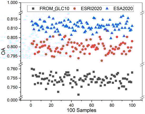 where OA is the overall accuracy of the confusion matrix, which can be understood as the ratio between the number of land cover class points that are correctly predicted by land cover products and the total number of validation points.