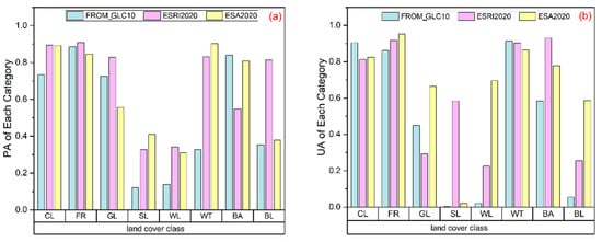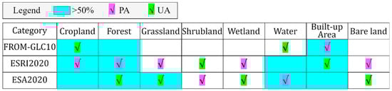 Land cover products are of great significance for conducting research on the human–land relationship, climate change, ecosystem management, and environmental protection on a global scale [1,2,3]. Driven by today’s high-resolution remote sensing images, land cover products also exhibit a trend toward a higher resolution. The free-access 30 m land cover products for 2010 have been gradually replaced by 10 m products. High-resolution land cover products can better identify the real distribution of the Earth’s biological resources, which is of great significance for improving the efficiency and suitability of the land cover [4,5]. Especially in the context of a rapid economic development and intensifying global climate change, land cover changes have far-reaching impacts on many aspects of the environment, ecology, and resources [6]. Currently, due to the availability of higher-resolution satellite images and the fusion of machine learning and remote sensing [7,8,9], creating global land cover products has become convenient and efficient and their creation has increased significantly over the last decade. A growing number of high-resolution land cover products have also been made publicly available for free, for example, the first 10 m resolution global land cover product (FROM_GLC10), released by the team of Professor Gong Peng of Tsinghua University, in 2017 [10]; the 2020 global 10 m land cover data released by ESRI, in June 2021 (ESRI2020) [11]; and the free 10 m global land cover product for 2020 released by the European Space Agency in, October 2021 (ESA2020). Hence, the rational use of data resources becomes more important than the availability of the data resources [12,13]. Comparing and analyzing the quality, advantages, and disadvantages of these products can not only provide directions for improving subsequent updates but also help us use these data more reasonably [14,15,16].