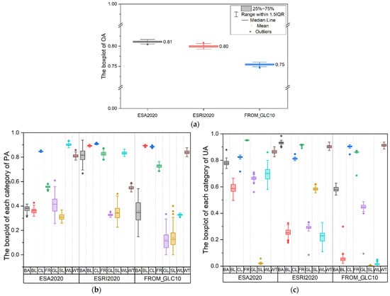 The number of points of each class do not match the area proportion of the land cover type. To address this problem, we used the stratification and random sampling method. We carried out 100 rounds of sampling. We analyzed the error of the 100 samples and measured the error using a box plot. A box plot, also known as a box-whisker plot, is used to reflect the central location and spread of one or more groups of continuous quantitative data distributions [67]. The upper quartile (75%: Q3) and the lower quartile (25%: Q1) of the dataset in the boxplots are the upper and lower quartiles of the middle rectangular box. The horizontal line in the middle represents the median value of the dataset (50%: Q2), and the number next to the box is the average value of the dataset. The ends of the two lines protruding from the upper and lower edges of the box are also called tentacles and are generally 1.51 QR away from the box (Q3–Q1, the length of the box). Thus, the upper end of the tentacles should be Q3 + 1.51 QR and the lower end of the tentacles should be Q1 − 1.51 QR. If the maximum value of the dataset exceeds Q3 + 1.51 QR or the minimum value exceeds Q1 − 1.51 QR, we call these data outliers, which indicates that they have exceeded the normal range [68,69].