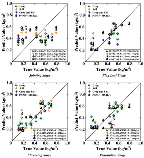 It can be observed from the scattergrams that the fused yield features spectral matrix FP have the greatest predictions. Especially in the flowering stage, the yield prediction models based on FP have the highest R2 at 0.8516 and lowest RMSE at 0.0744 kg/m2. Moreover, compared with the combination of spectra of crop and soil, the yield prediction models based on FP have a better predictive performance on four growth stages. This proves that the proposed method PNMF−MCF could mine the intrinsic yield features from canopy spectral data and achieve the effective fusion of the yield features from crop and soil.
