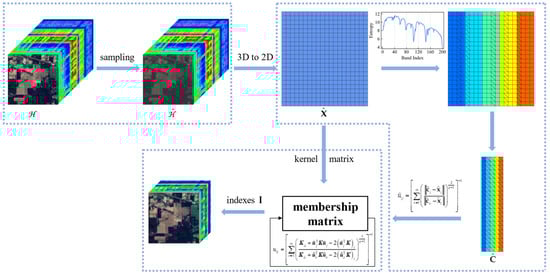 To mitigate the computational burden of FCM clustering, we resort to kernel function. For kernel clustering, the band vector xi can be mapped from the input space to the feature space through a non-linear mapping function, such as polynomial kernel function or Gaussian kernel function . In addition, the mapping can also be performed by the linear kernel function . The kernel function can calculate the Euclidean distance based on the feature space without knowing the feature transformation rules, and it provides a more general way of representing the elements of X, enabling the easy identification of clusters []. Given a set of n band vectors, we can construct a kernel matrix , where each element . Matrix K represents the transformed feature space. It can be seen that the dimension g of the input space has no effect on the kernel matrix, and the trick of kernel function can effectively cope with the high-dimensional input data.