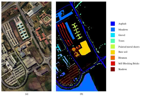 The Pavia University dataset was captured from the ROSIS sensor in the city of Pavia, northern Italy, in 2003, and it contains 610 × 340 pixels and 115 spectral bands varying from 0.43 to 0.86 μm, with a spatial resolution of 1.3 m. Because of the noise band removal, the number of bands used is 103. There are nine categories of ground objects. Figure 5 shows the pseudo-color image and ground object type image of this dataset.
