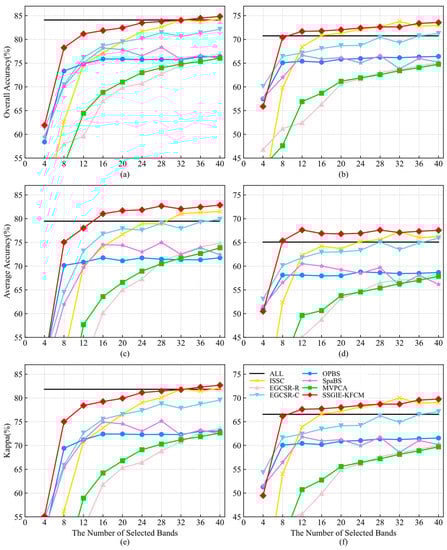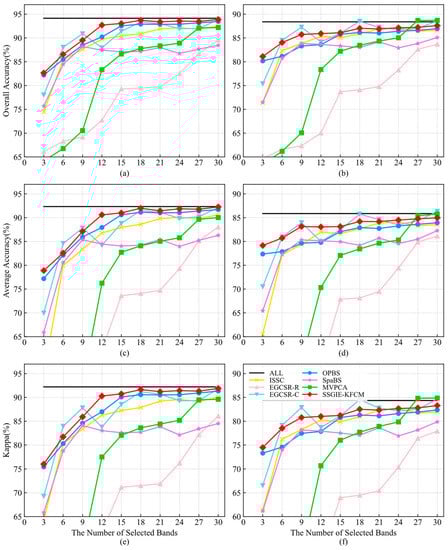 Throughout these curves, OPBS achieves a more remarkable classification effect when using four and eight bands, but then it stabilizes without a significant improvement. The accuracy curve of SpaBS is not stable. Although EGCSR-C can continuously improve the accuracy as the number of bands increases, a certain gap in the accuracy exists compared with the proposed SSGIE-KFCM. The performance of EGCSR-R and MVPCA is similar and has also been improving, but poor results have been achieved.