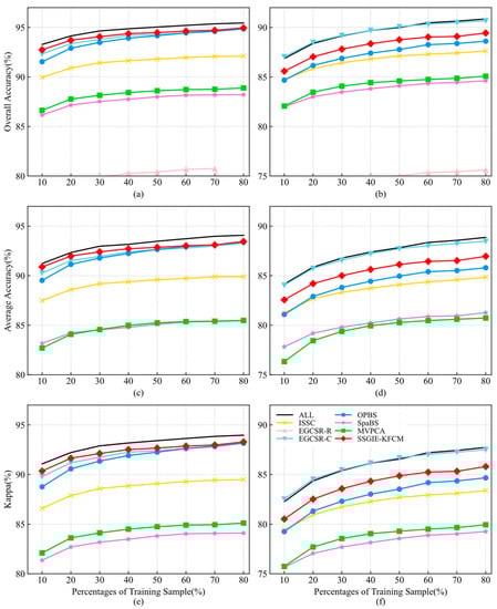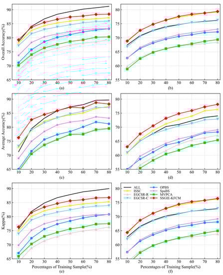 This section applies different band selection methods to extract the same number of bands to analyze the relationship between different training sample sizes and band selection results. It then uses the results to implement classification experiments under different classifiers and different proportions of the training sample, in which 10% to 80% of training samples are selected, and the step length is 10%. The experimental results in Section 4.3 show that the classification accuracy of SVM is higher than that of KNN. For the SVM classifier, when the band subset sizes are set to 28 and 18 for the Indian Pines dataset and the Pavia University dataset, the classification performance obtained by some methods is closer to that obtained by using all bands, and can obtain local optimal accuracy. Therefore, this section adopts the number of bands mentioned above for the classification experiments, and the classifier settings and evaluation indices are the same as those in Section 4.3.