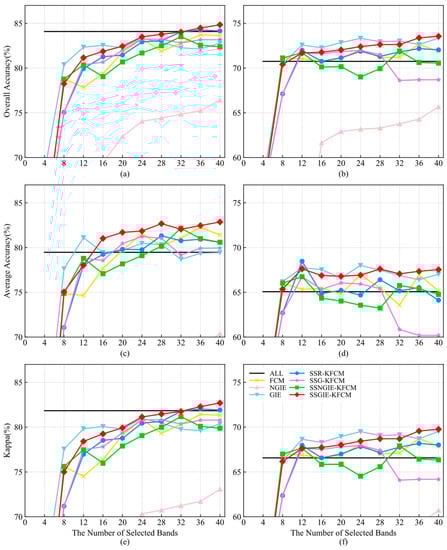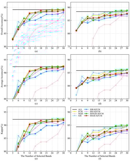 From the above analysis, we can see that, in most cases, our proposed SSGIE-KFCM method can obtain the best classification performance, while it is not the best in a few cases. Nevertheless, it can also rank second and third with little difference from the first. When a few bands are selected, the effect of using all bands is achieved. Moreover, for the Indian Pines dataset, the classification accuracy obtained after selecting a certain number of bands is significantly better than that obtained by using all bands, effectively attaining the goal of dimensionality reduction.