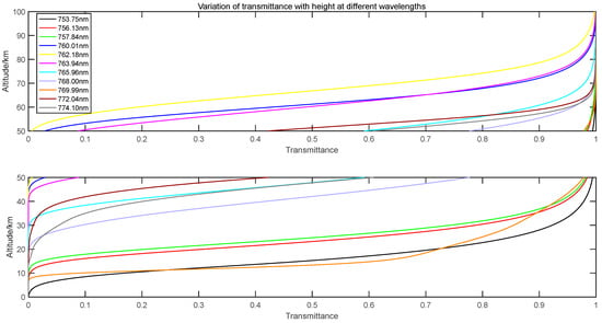 Variation of transmittance of 11 wavelengths at a low latitude in near space. The specific wavelengths were determined according to the HITRAN database. To better observe the altitude coverage of each wavelength transmittance, especially below 20 km and above 60 km, it is divided into two maps, with 50 km as the limit.