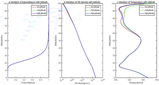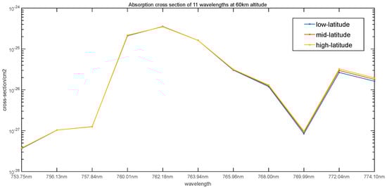 The absorption cross-sections of different wavelengths at 60 km tangent height at different latitudes of low, middle, and high are shown in the figure. The absorption cross-section hardly varies with latitude but changes greatly with the wavelength, of which around 762 nm has a strong absorption line.