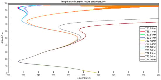 At present, the existing temperature distribution results show that [], in low latitudes, from the ground to the troposphere of approximately 17 km, the temperature decreases with the increasing altitude. The temperature increases when the height reaches approximately 55 km. When the stratospheric top reaches 85 km, the temperature drops rapidly. From the top of the middle layer to the hot layer, the temperature rises. By analyzing the temperature inversion results, it is found that the inversion profiles of all wavelengths almost show this trend, but they show obvious differences in the middle layer, especially at 769–774 nm. The temperature begins to rise gently at approximately 65 km and 72 km, respectively. Other wavelengths show good agreement with the existing results.