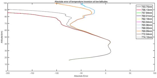 By analyzing the absolute and relative deviation distributions in the figures, the maximum absolute deviation at a low altitude of 14–20 km is approximately 70 K, and the corresponding relative deviation is 27%. Analyzing this is not within the scope of this research. With an increase in height, the deviation decreases. At 20–50 km, the maximum relative deviation is 15%, the minimum is 0, and the minimum accuracy is 0.15 K. At the height of 50–100 km, the relative deviation of 753–768 nm is within 13–20%, and the minimum accuracy is approximately 20 K. The relative deviation of other wavelengths is too large, which means that the detection accuracy is low.