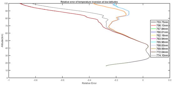In addition, analyzing the error results for the first eight wavelengths, there is a great difference between the two below 20 km. The minimum deviation of the former is 0, and the deviation increases with the height, while the maximum deviation of the latter is 20% and decreases with the height. The deviation of 20–60 km is within 10%. Above 60 km, the deviation of the latter is 10–20%, and the error of the former is too large at the height of 95–100 km. The comparison results show that, except for the tropospheric height, the detection accuracy of temperature at different latitudes is close. Because the detection area considered in this paper is near space, the inversion results of the troposphere can be ignored.