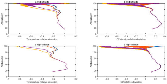(a) Relative deviation of middle latitude temperature; (b) Relative deviation of oxygen number density at middle latitude; (c) Relative deviation of high-latitude temperature; and (d) Relative error of oxygen number density at high latitude. The wavelength represented by each color in the figure is consistent with the previous illustration, so it will not be repeated here.