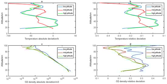 Absolute and relative deviations of temperature in (a) and (c) respectively. Absolute and relative deviations of oxygen number density at different latitudes in (b) and (d) respectively.
