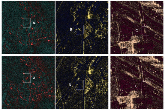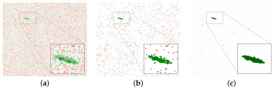 The median filter [40] is a nonlinear method that defines the median value within a set window area and removes outliers that are beyond the sorted values. The bottom right box in Figure 5c shows the effects of the median filter that highlights the shape by filling the pixels of the changed objects displayed in green and removing almost all the background pixels. Through this process, a clear change detection map was obtained. As shown in Figure 6, after applying the scale-adaptive modification and median filter proposed to DI, it can be confirmed that the clutter part of the noise around the target was completely removed, and the features of the targets were obtained.