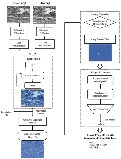 In the preprocessing step, we first performed radiometric calibration, which is the process of objectively quantifying each image by calculating the net reflection value for the topography and ground features. Equation (1) derived from the final updated KOMPSAT-5 SAR processor and the absolute radiation correction results described by Yang and Jeong [36] were applied in the radiometric calibration.