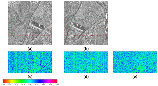 The primary image () in Figure 3a and secondary image () in Figure 3b were obtained from June 2018 and September 2018. The DI is the result of linear subtraction of the secondary from the primary image. The structure shown in Figure 3a,b (i.e., the red-dotted box), appears in a different position; it denotes the value of the positional error between the two images. To verify the performance of our proposed registration method, we compared the results with those of two other methods. The first method suggested matching the two images using the orbit and precise external digital elevation model (DEM) data. Each primary and secondary image was required to be resampled in a bilinear method to be matched based on the DEM. We used the external Shuttle Radar Topography Mission (SRTM) 1 arc sec DEM [39] file in the Geotiff format. As the previously used image of the KOMPSAT-5 was taken with precise orbit processing at the level product step, the additional orbit matching process was not required. As a result of the DEM based registration, as depicted in Figure 3c, we observed an inconsistency as the roads or structures appeared as two lines. The DI by the second method in Figure 3d was generated by the cross-correlation method; in this method, FFT was not applied, unlike our proposed two-step registration. This method is widely used, and unlike the DEM method, the matching performance is satisfactory, as shown in Figure 3d. However, a peculiar pattern may occur during the resampling or warp process. In addition, when the initial position error between the pair of images is large, registration fails. The results of our two-step coregistration are shown in Figure 3e. Unlike the other two methods, the overlapping phenomenon completely disappeared, and a clear DI could be obtained, as depicted in Figure 3e.
