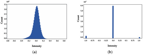 As shown in Figure 4a, in the dynamic range distribution of the DI, the left tail of the graph denotes the part that exists only in the secondary image and the right tail corresponds to the primary image. The middle part in Figure 4a is present in both images; therefore, it can be considered to be noise or an unchanged part similar to the background in both images. As our final goal was to detect the changed objects in the two images, it was necessary to maximize the difference by analyzing the dynamic range and modifying the distribution by applying Equation (3).