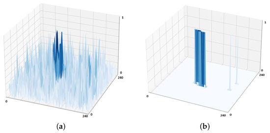 3D distribution of change detection results around the target applied by the proposed scale-adaptive modification. (a) 3D Histogram of original DI. (b) 3D Histogram of modified DI.