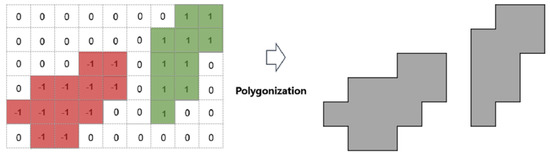 In this process, neighboring pixels with the same value comprise one polygon. Through polygonization of the pixel groups on the dimension map, each pixel group can be analyzed as an object with its shape. As shown in Figure 7, zero-valued pixels were considered to be noise; therefore, they were not converted into polygons, and all corresponding information was deleted. Only two polygon sets, one composed of −1 valued (red) pixels and the other of 1 valued (green) pixels, were created and considered as candidate groups of objects.