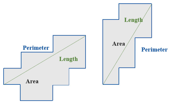 Finally, to distinguish meaningful targets from incorrect objects, such as artificial structures, the long axis of the polygon was calculated as the length of the target, as depicted in Figure 8. After creating a line connecting all points of the polygon, the maximum length of the polygon was set as the longest line. In this study, only polygons longer than 10 m (10 m-size) were selected as the final target object.