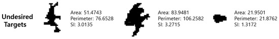 where is the perimeter of the input polygon ith and is the area of the ith input polygon, respectively. When the SI value is close to 1, the polygon has a form close to the regular form, such as a circle or square, whereas the polygon has an elongated atypical form when the SI value is large. The SI is applied for the first time to target extraction in SAR images in this study and is used as a discriminator to differentiate between undesired and target objects. The criteria for each parameter were also set through morphological analysis of the ground truth data. The morphological parameters are shown in Figure 8.