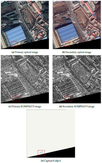 The CNES/Airbus and Maxar [42] optical images were used as auxiliary data to understand the extraction performance. Figure 11, Figure 12 and Figure 13 depict examples of verification of the extraction performance by comparing the developed methodology with optical images. Figure 11a, Figure 12a and Figure 13a are matched optical images with the SAR primary image shown in Figure 11c, Figure 12c and Figure 13c and Figure 11b, Figure 12b and Figure 13b are matched with Figure 11d, Figure 12d and Figure 13d. The red dotted boxes in Figure 11e, Figure 12e and Figure 13e indicate the area from which the change object was extracted.